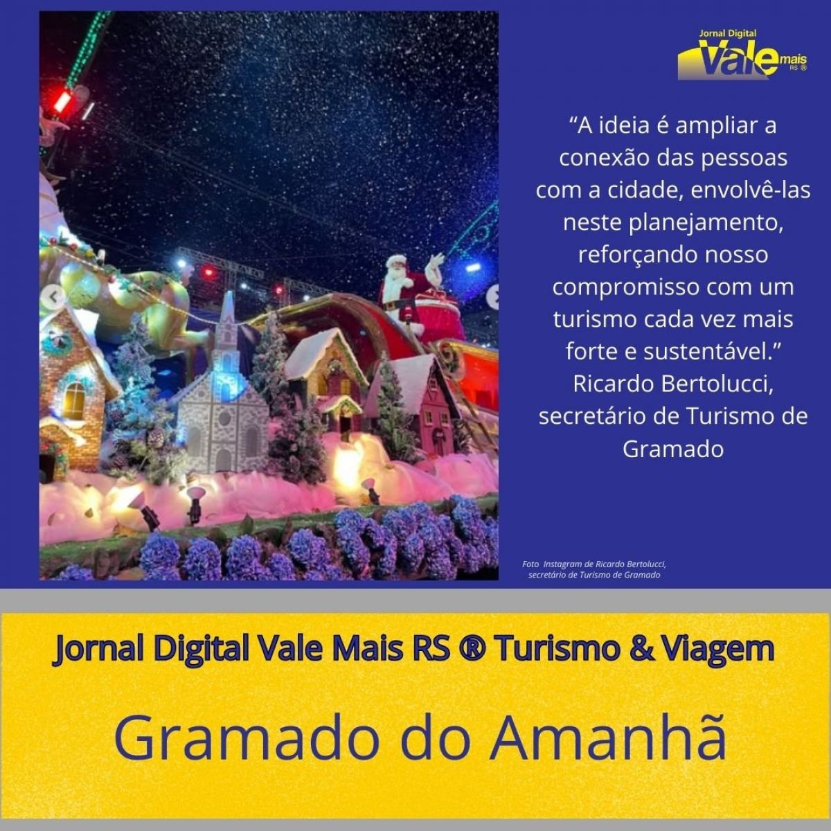 "Vamos ouvir moradores, visitantes, empresários, comerciantes, gestores e todos que se relacionam de alguma maneira com Gramado. A ideia é ampliar a conexão das pessoas com a cidade, envolvê-las neste planejamento, reforçando nosso compromisso com um turismo cada vez mais forte e sustentável. É uma medida importante para a consolidação de uma Gramado cada vez mais resiliente e conectada o futuro", destaca Ricardo Bertolucci, secretário de Turismo de Gramado.