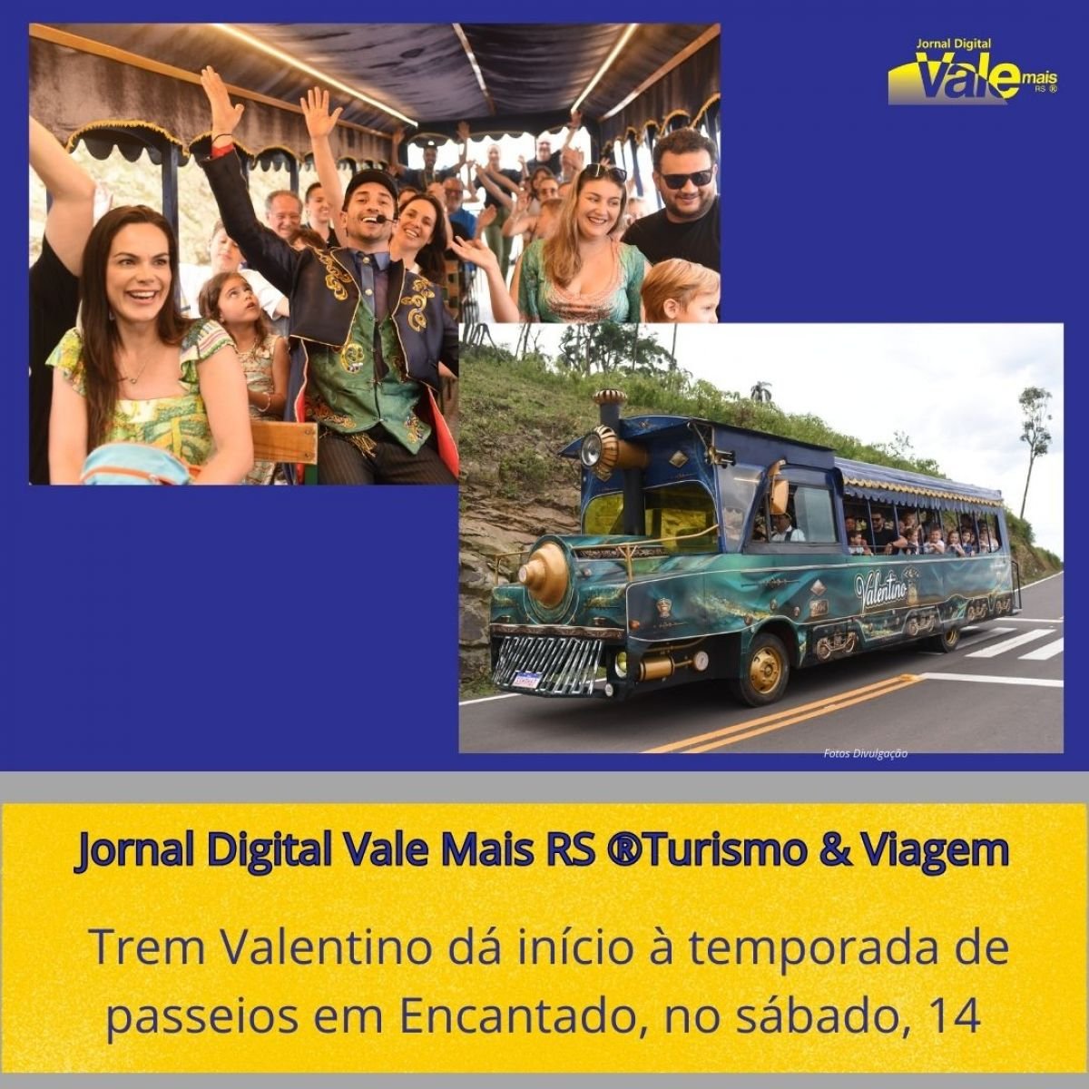 Depois dos passeios-teste realizados em novembro, o Trem Valentino está pronto para iniciar oficialmente os primeiros roteiros por Encantado. De 14 a 29 de dezembro, o ônibus temático em formato de trem maria fumaça fará passeios por dois roteiros distintos: Boulevard Encantado e Centro. Os bilhetes serão vendidos diretamente no trem, pelo valor de R$10,00.