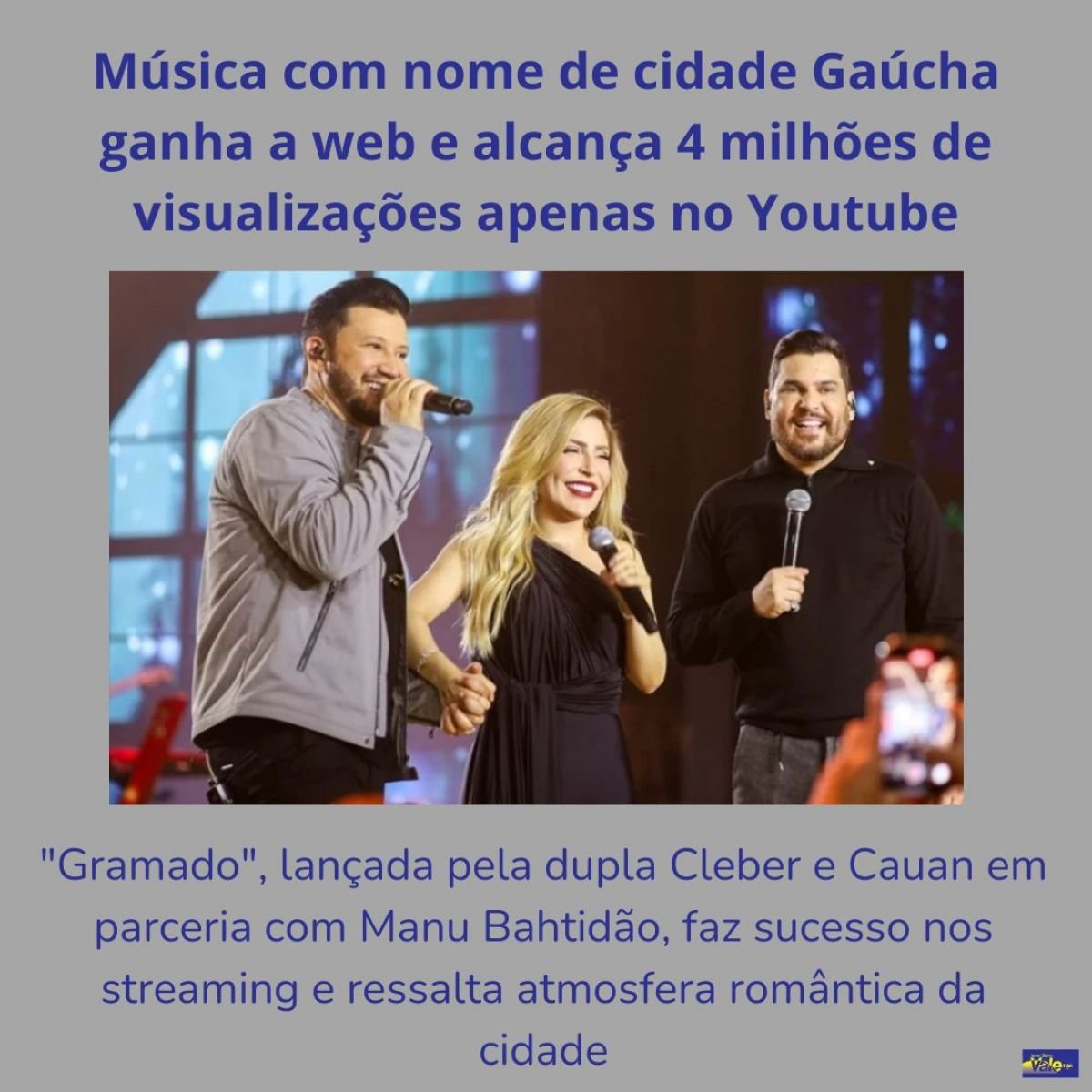 Lançada no último dia 14 e já somando quase 4 milhões de visualizações apenas no Youtube, sem contar com dados de outros stramings (Como spotify, deezer e outros), a música Gramado ganhou os corações (e os ouvidos) dos fãs da dupla Cleber e Cauan. A música é uma parceria com a cantora Manu Bahtidão e faz parte do EP "Saúde Mental".
